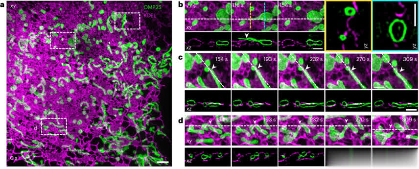 4Pi-SIM通过采用大斯托克斯位移荧光蛋白dCyOFP2s与绿色荧光蛋白结合,实现了用单个激发波长进行双色成像。在对活HeLa细胞中内质网和线粒体的双色成像中,观察到二者在特定区域的频繁相互作用,如内质网与线粒体纳米隧道的接触,以及线粒体在接触位点的融合和裂变事件。