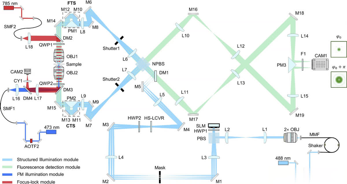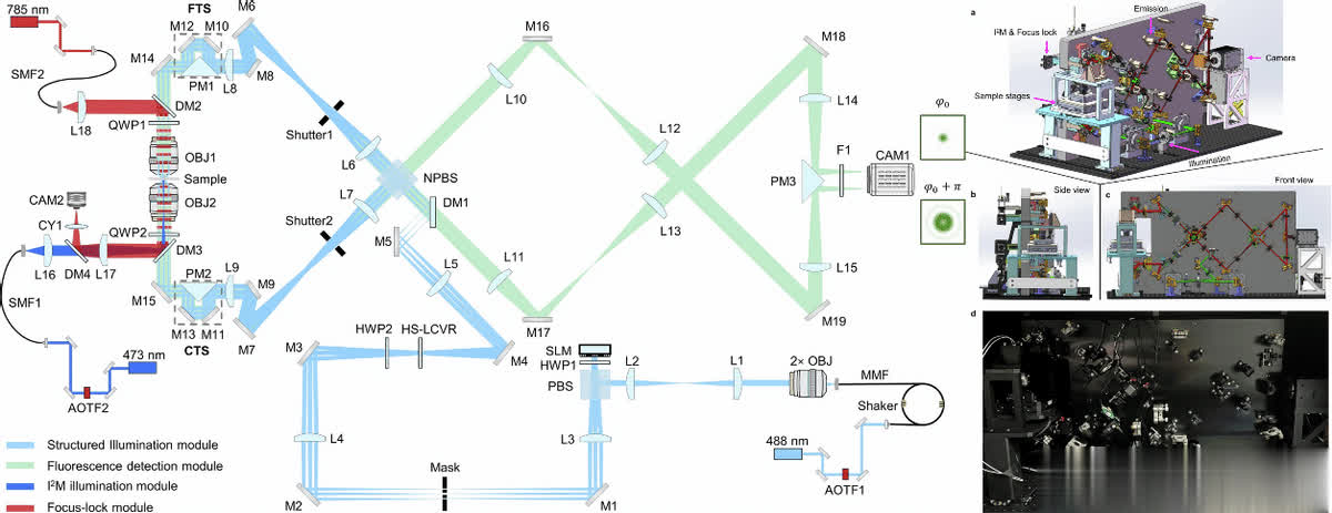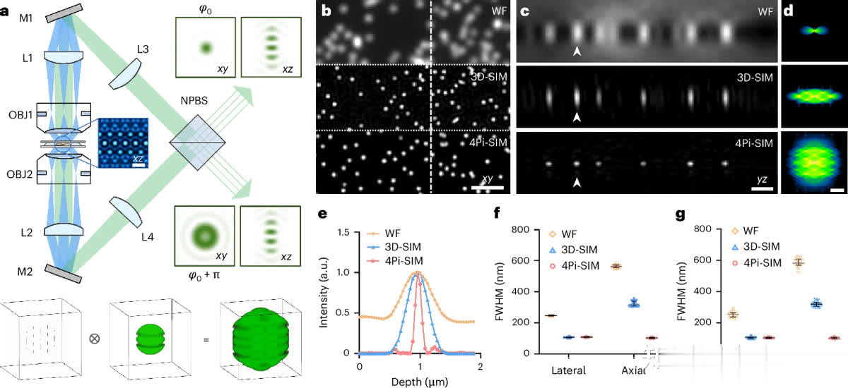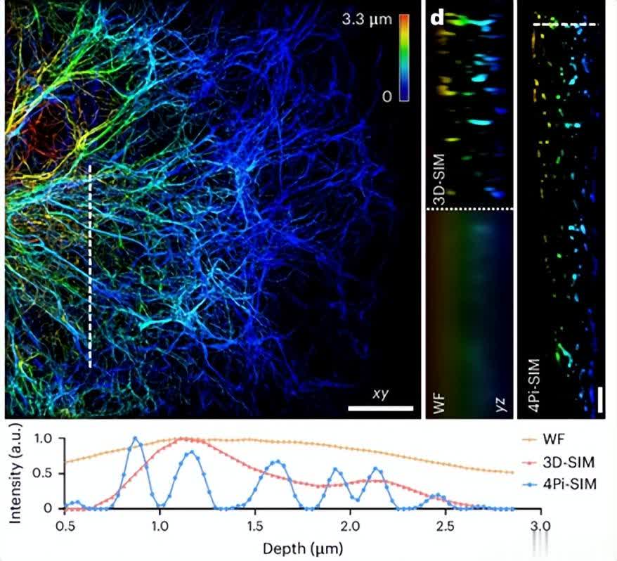 在细胞生物学领域,深入探究活细胞的三维行为及动态变化,对于揭示细胞过程的奥秘和生命的基本要素至关重要。荧光显微镜作为常用工具,虽具分子特异性且适用于活细胞样本,但分辨率受光衍射限制,难以清晰分辨小于200nm的细胞特征。而超分辨率技术的出现改善了这一状况,其中结构化照明显微镜(SIM)具有与传统荧光团兼容、光毒性低和成像速度快等优势。在此背景下,4Pi-SIM应运而生,它在3D-SIM基础上进一步改进,通过协同3D-SIM与干涉显微镜,实现了各向同性光学分辨率,为亚细胞结构和动力学研究带来新突破。