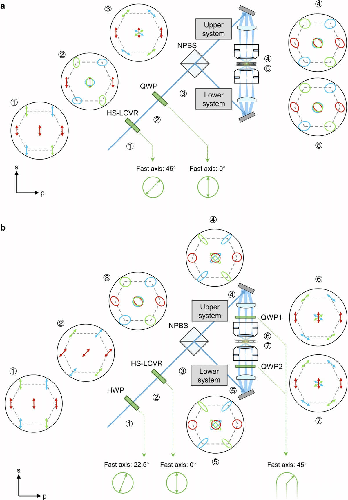 在照明光束路径中,为保持六个输入光束的s偏振以最大化SIM分辨率扩展能力,采用HS-LCVR和QWP组合。然而,照明光路中的光学元件会导致s和p偏振光相位不等,使线偏振光退化为椭圆偏振光,降低调制对比度。为此,通过特定的光学元件布局,如将HS-LCVR与镜子的s偏振对齐,重新定位QWP,可补偿相位差,有效改变照明光的偏振态。