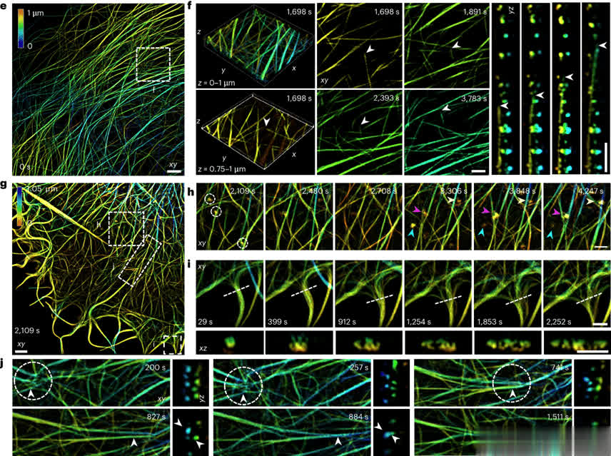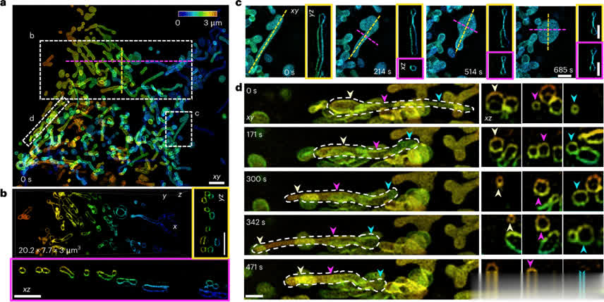 利用水浸物镜,4Pi-SIM可对活细胞进行时间推移体积各向同性成像。例如,在对活HeLa细胞中的线粒体成像时,清晰捕捉到线粒体膜的动态行为,包括形状变化、纳米隧道形成以及融合和裂变过程。