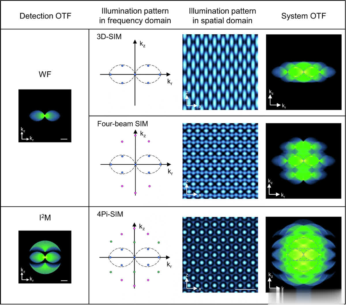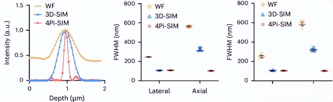 4Pi-SIM通过六个照明光束在样本平面干涉以及两个物镜检测到的荧光波前相干组合来实现各向同性三维分辨率。在空间频率空间中,其照明OTF与检测OTF支持卷积,产生有效4Pi-SIMOTF,从而提升分辨率。例如, OTF测量结果可清晰看到,4Pi-SIM相比3D-SIM和WF显微镜在分辨率上有显著提升。