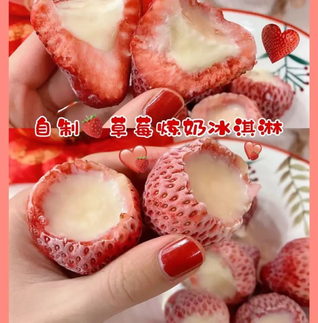 还有些网友们还开发出了懒人版草莓冰淇淋:将草莓屁股处掏个小洞,倒入一勺酸奶,冷冻后变成夹心草莓冰淇淋。冷冻的方法延长了草莓的赏味期,又让我们尝到新的美味,也是不错的做法。